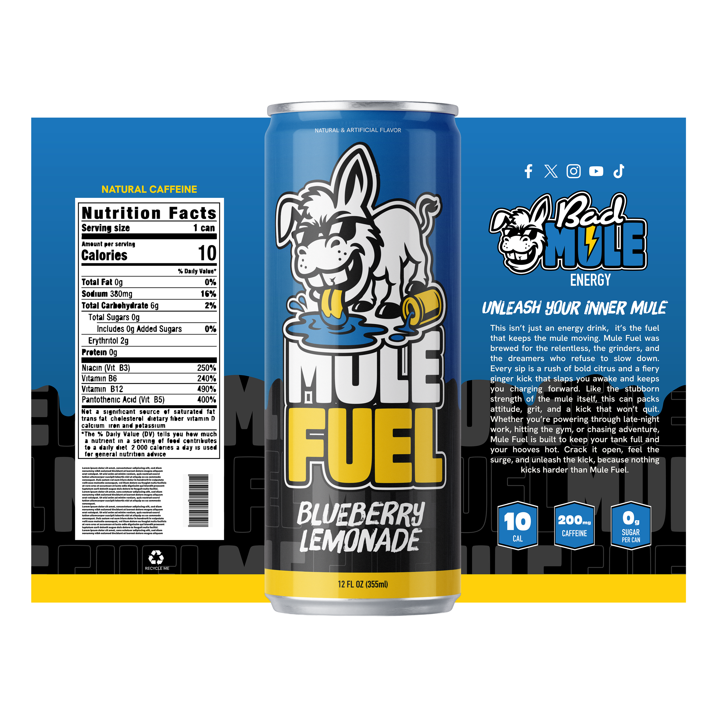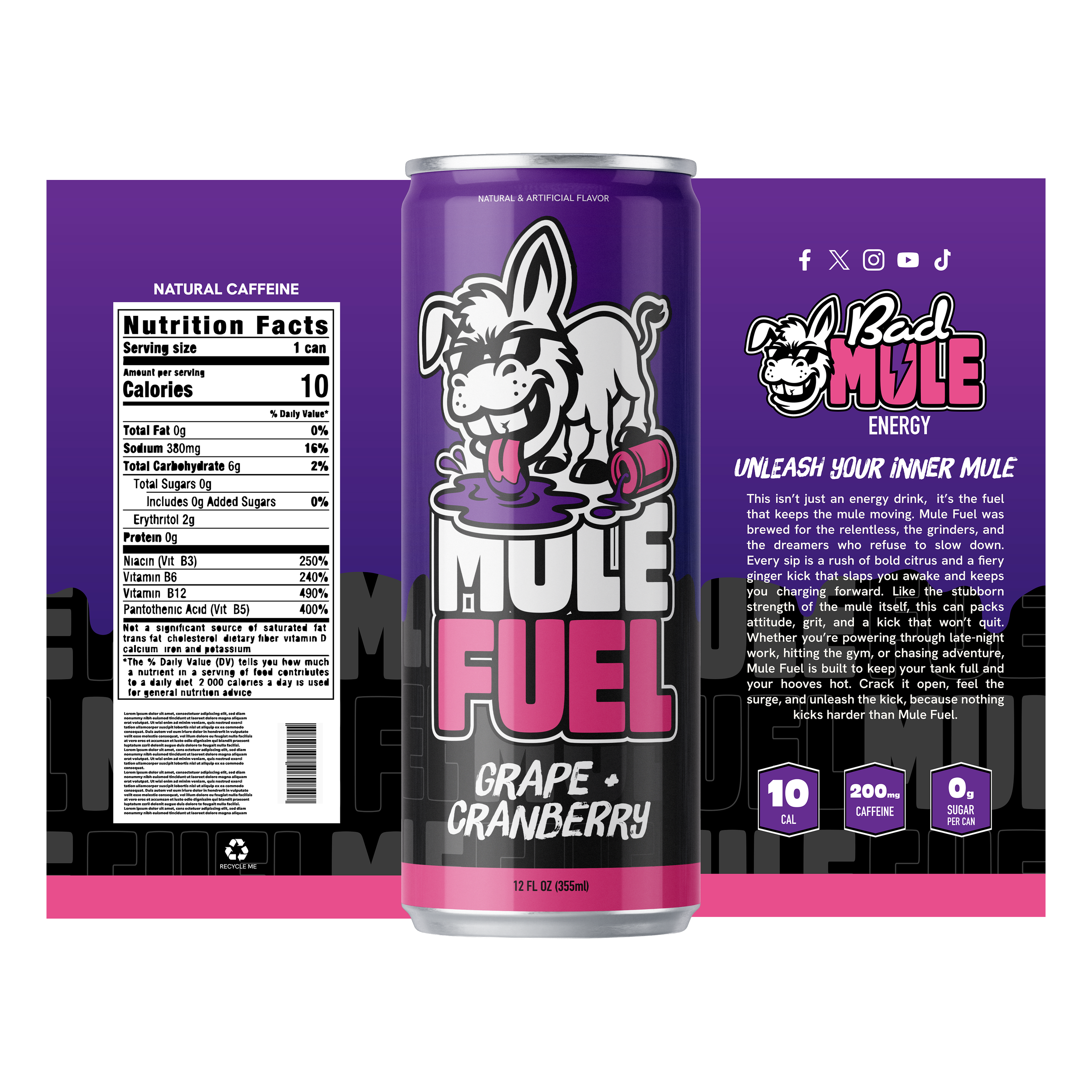 Bad Mule Energy started as a bold, personality-driven concept built around a fun mascot and high-energy visual style. The goal was to create something that felt loud, playful, and instantly recognizable. Leaning into humor and attitude while still feeling polished enough to live across packaging, merch, and marketing.