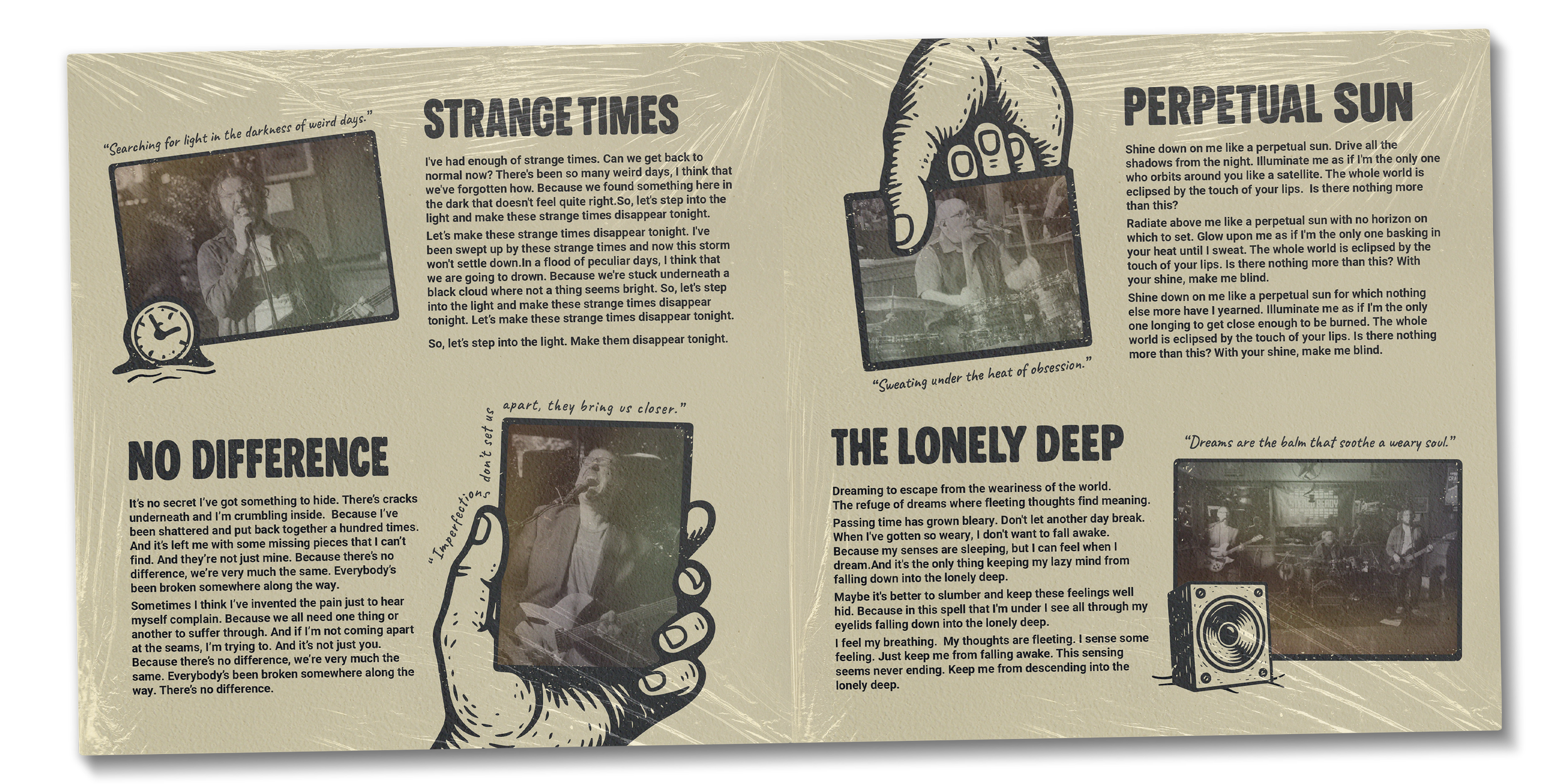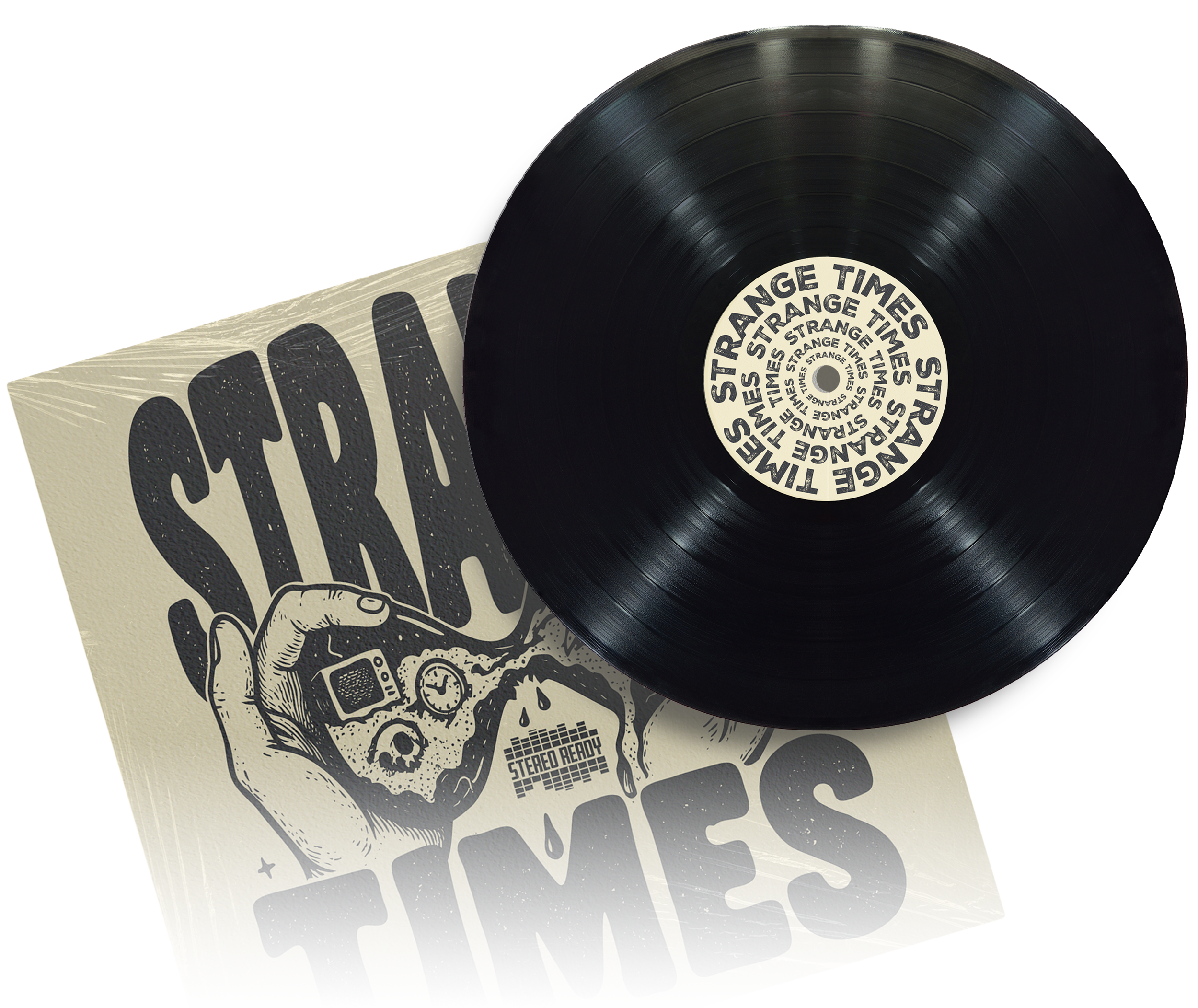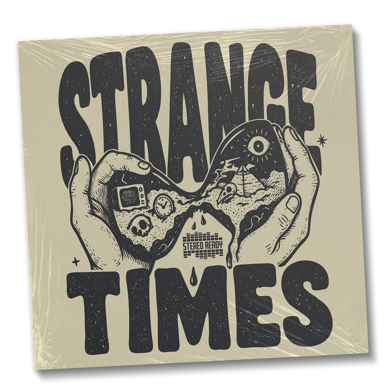 Album artwork created for the band Stereo Ready. This design blends surrealism and symbolism to reflect the mood and message of the album. Featuring an alien puppet master pulling the strings over a split reality, the illustration captures themes of chaos, media saturation, and existential curiosity. From clocks and skulls to pyramids and speakers, each element tucked inside the split mindscape hints at the strange world we’re navigating. The hand-drawn black-and-white style, paired with distressed textures and red handwritten typography, gives the design an underground zine-inspired aesthetic.