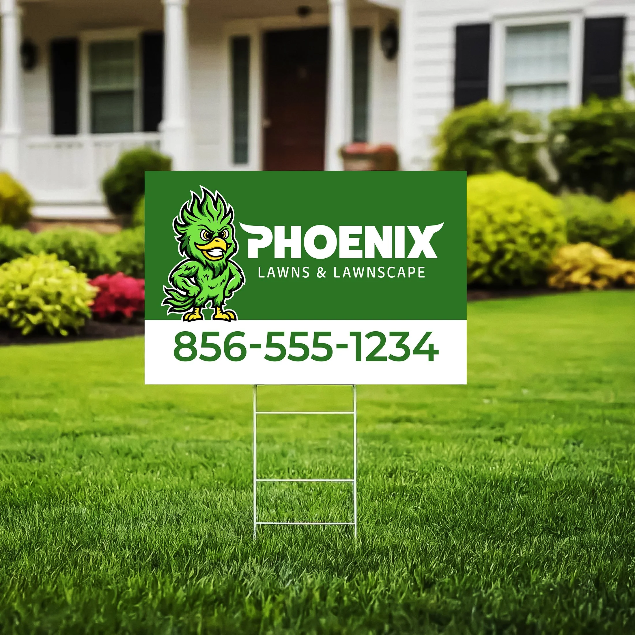 The Phoenix Lawns & Lawncare logo was designed to work seamlessly across all forms of media — from yard signs and vehicle wraps to uniforms, business cards, and social platforms. Its bold typography and distinctive mascot make it instantly recognizable whether printed large on a truck or scaled down for digital use. The consistent use of the color palette ensures a unified brand presence, helping Phoenix stand out as a professional, trustworthy local lawn care company across every touchpoint.